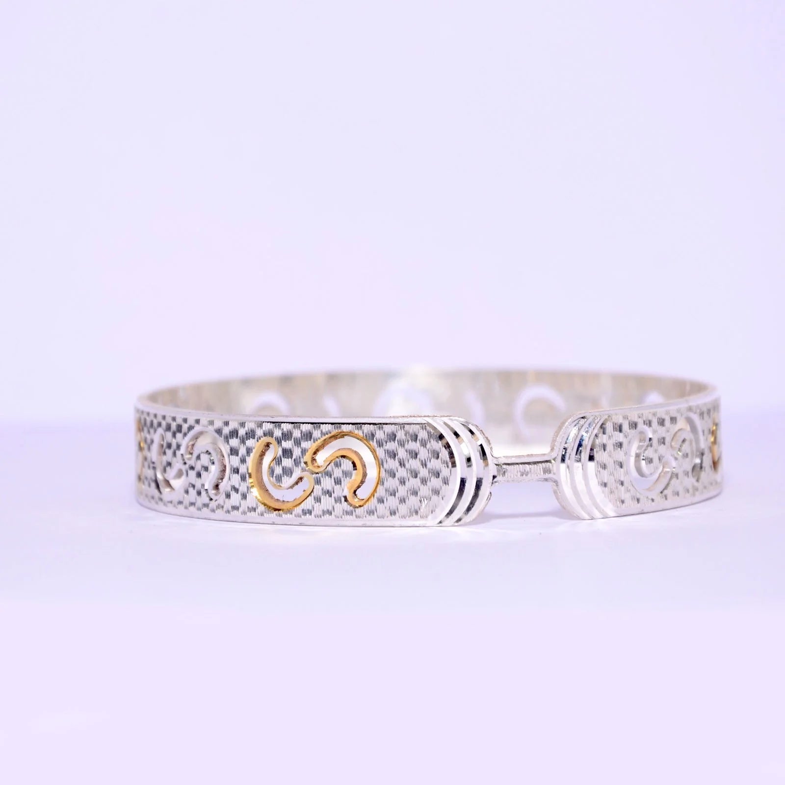 Step into timeless elegance with the Men’s Silver Kada, a versatile unisex design crafted for both men and women. Made from hallmarked 925 sterling silver, this kada features a modern laser-cut design highlighted with a golden polish finish, giving it a luxurious two-tone appeal.