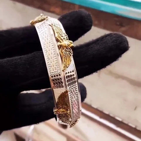 Made from 925 sterling silver, this kada features a V-shaped structure accented with three parallel engraved lines and a bold eagle motif, symbolizing strength, courage, and leadership. With an approx. weight of 30 gm, it is both lightweight and durable, offering a comfortable fit for daily wear while making a striking impression.